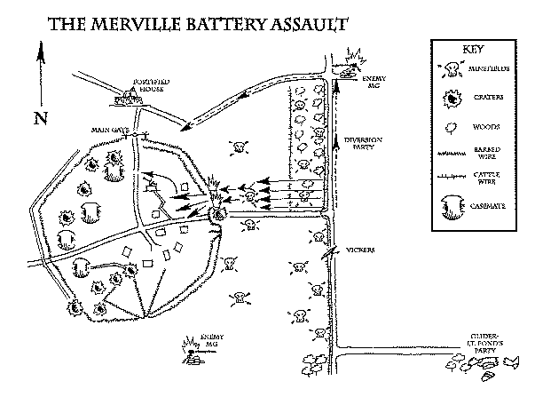 Gliders transporting the 9th Battalion's mortars, anti-tank guns, mine detectors, in fact all their heavy equipment had also not arrived. There was only one Vickers machine gun. Once again the smoke and dust clouds resulting from the bombing raid had caused the problems. Map reading had been impossible. With the strong wind, the pilots had struggled to control their gliders, and landed to the south-east of the DZ amongst anti-landing poles, causing seven deaths and many casualties. There was to be no support equipment for the assault on the Merville Battery. By the appointed time of 2.35am only 110 men had reported to the RV, however, the Colonel had allowed a 'window' of 15 minutes for problems, and so waited a little longer. During this time about 40 others arrived to raise the strength of the group to around 150 men. They then began their journey to the Battery. En route they met Major George Smith, commander of the Troubridge Party. Some of his news was good, some of it bad. He had cut the outer wire fence, crossed the large minefield, and lain by the inner belt of wire for half an hour listening to the conversation of the Germans inside the Battery. The defences were no tougher than had been expected, but due to the loss of the mine-detectors and tape, a path had had to be cleared through the mines by searching for them with their bare hands and making them safe one by one. To mark the path they had dragged their feet to scratch two lines in the earth. The attack by the heavy bombers had missed the Battery.
